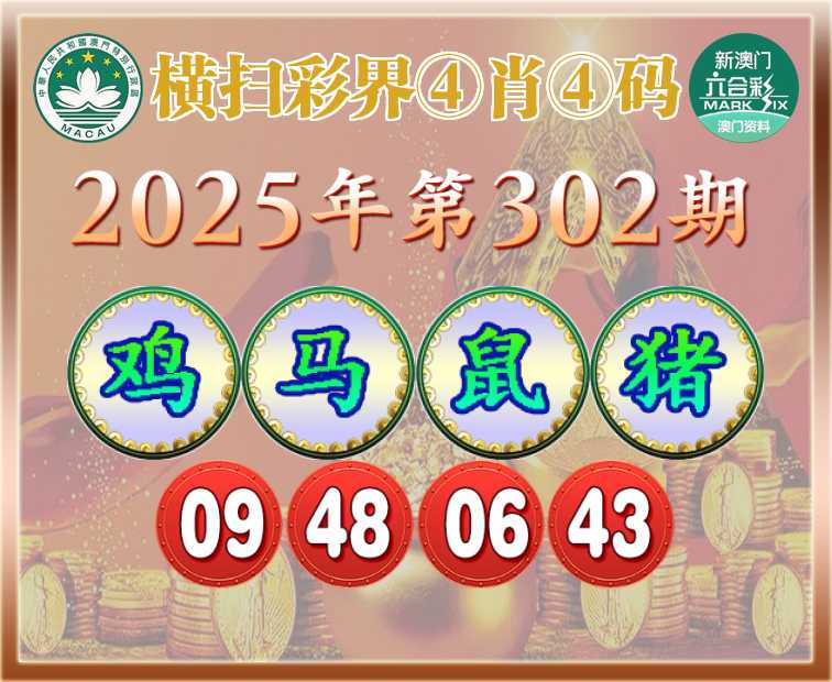302期:【横扫彩界】 ④肖④码【鸡马鼠猪】【09.48.06.43】开:猴22